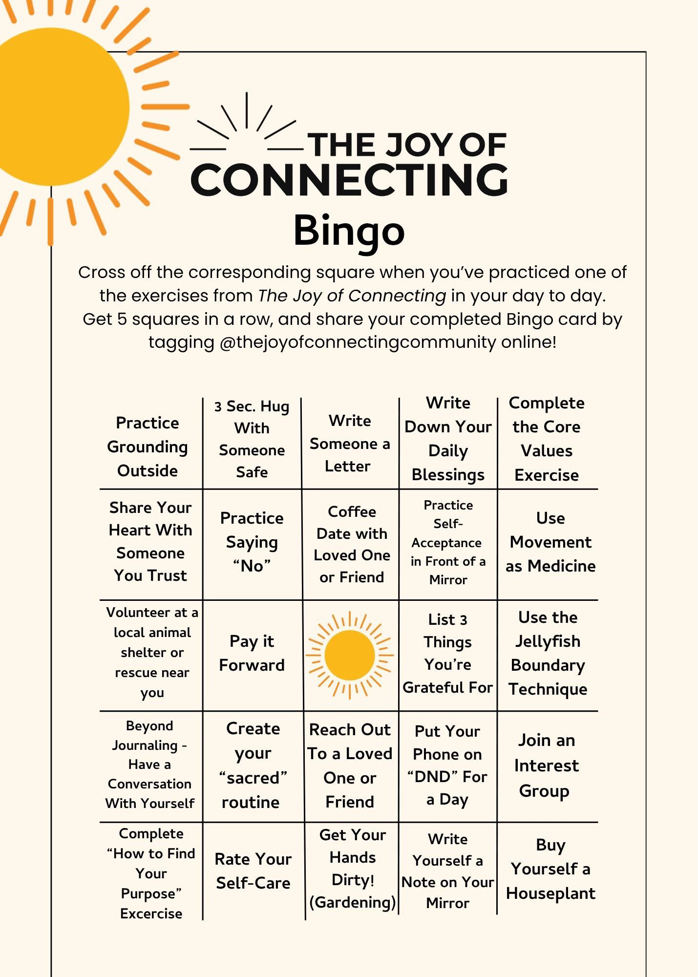 You're invited to download this graphic, play along, and share on Instagram. Cross off the corresponding square when you've practiced one of the exercises in the book. Get 5 squares in a row, and share your completed Bingo card by tagging @thejoyofconnectingcommunity online!